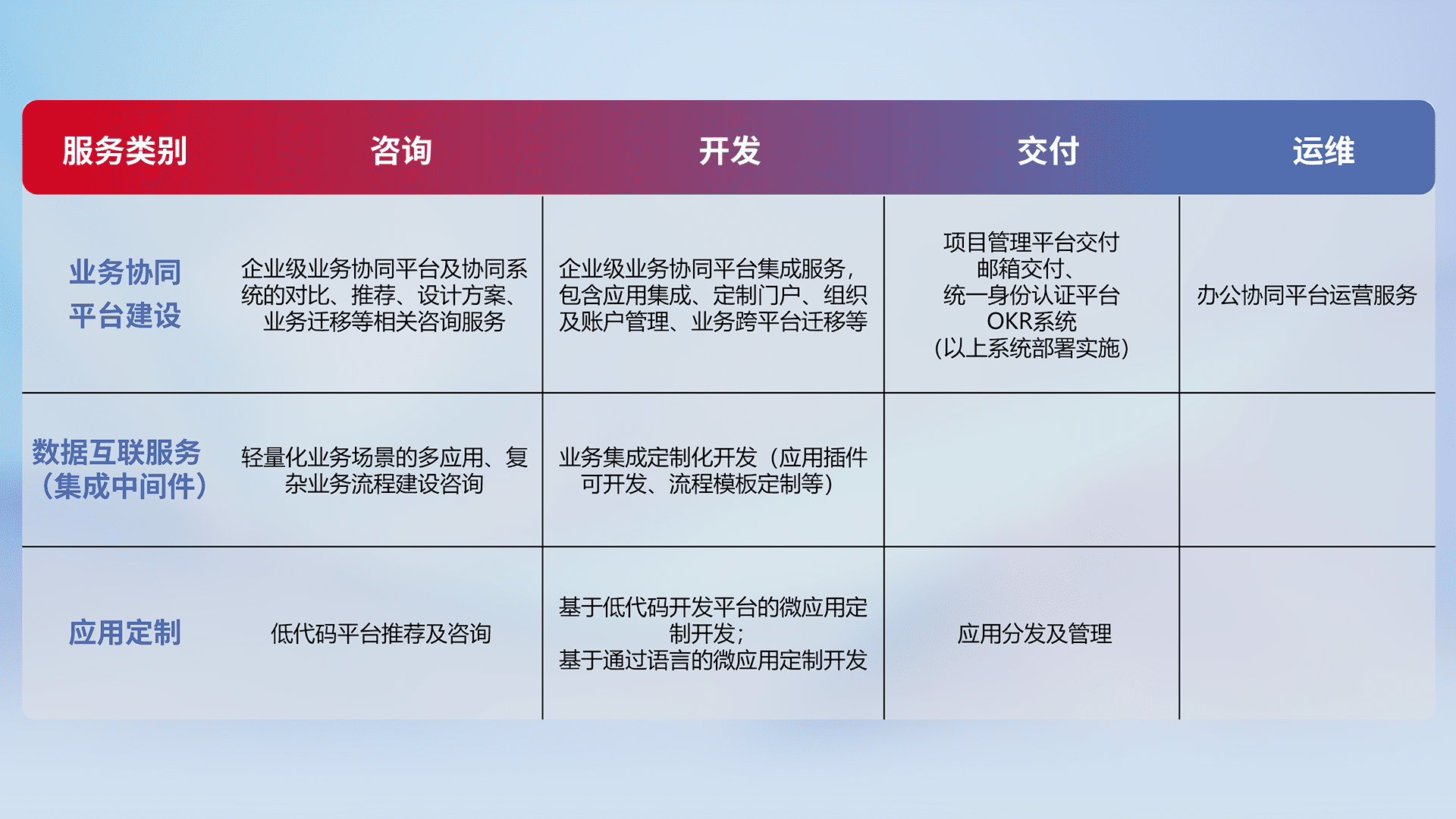 针对钉钉、、、企微、、IDaas等平台级产品提供产品的规划、、方案、、交付、、、、定制化开发等服务,,,,实现如统一协同办公、、、智能客户服务、、、混合会议管理、、、智能数据查询、、、、等业务场景,,,,实现数字化转型。。。。