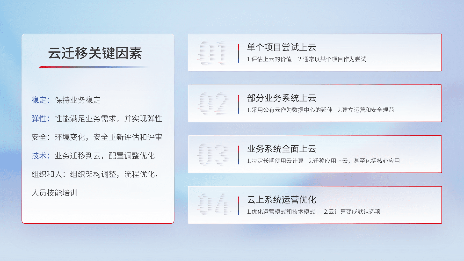 结合实际业务,,,,从规划设计、、、、云平台选型、、、云原生改造、、、、数据迁移、、、、集成交付,,,迁移全过程为客户识别最佳上云路径,,,,做好风险识别管理,,,设计网络架构、、身份权限、、安全审计合规、、、、操作审计、、日志审计、、、、监控告警策略、、、多站点容灾设计等,,对云上基础设施进行整体规划,,,,提升IT治理水平,,以满足弹性、、高可用、、、、高性能的需求。。。