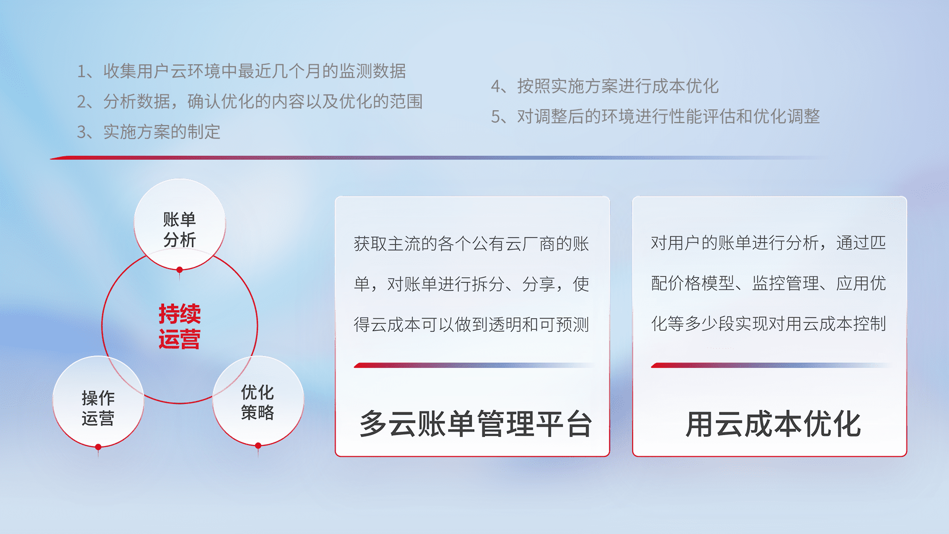 通过灵活运用多种自动化迁移工具,,,,帮助企业用户实现业务和数据高效 、、、稳定的上云迁移和云上迁移,,,,采用自研多云纳管平台,,以中立管理模式,,,,解决多组织、、多云、、、多运维厂商的复杂关系的管理,,保证多云平台资源配置的一致性,,,,实时掌控云资源运行数据,,,运用智能化工具分析云资源多云平台的管理服务,,,透明化管理成本支出,,,用云成本可预测、、、用云费用可优化、、、云资源配额有据可依。。