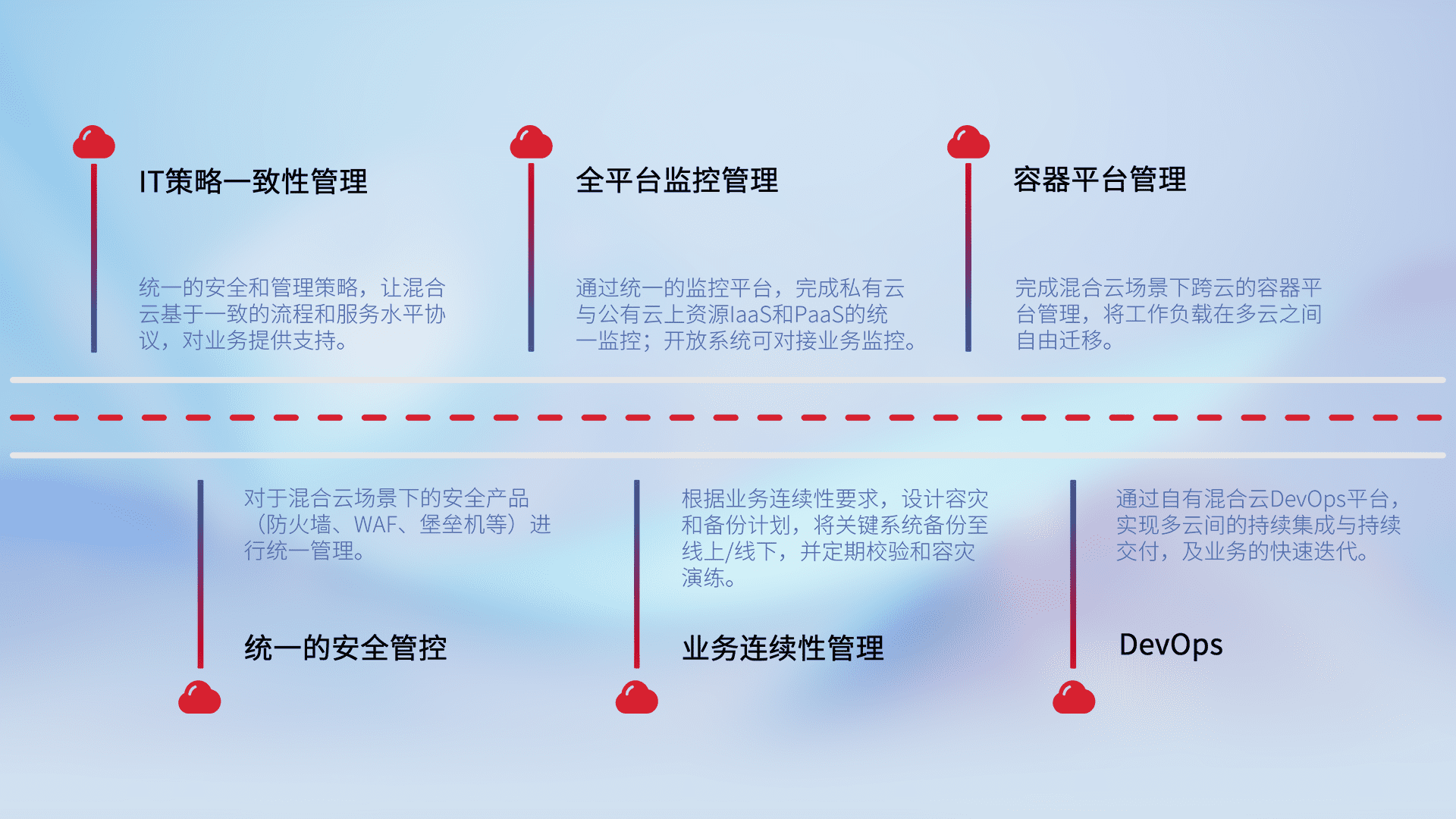 通过多云纳管,,,以统一的资源数据模型把客户的云资源进行抽象和封装,,,进而实现对多云资源的统一操作,,保障云资源管理的可靠性、、、稳定性与可用性。。。量身定制化运维内容,,,配置、、开发运维、、、、补丁管理、、、备份、、、监控、、认证和访问管理、、、审计和日常巡检等,,,保障在用云过程中的可靠度,,稳定度以及高可用率。。。